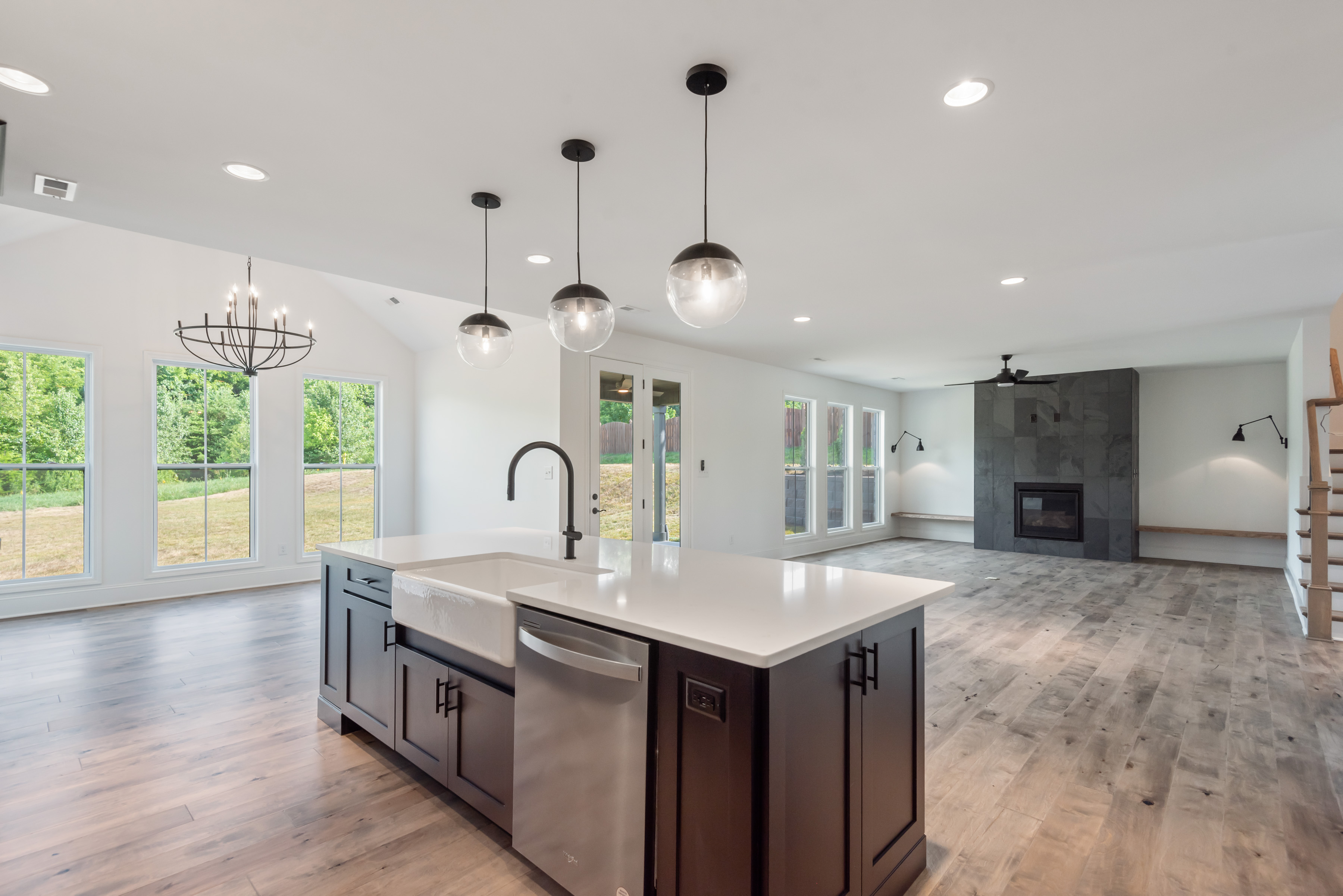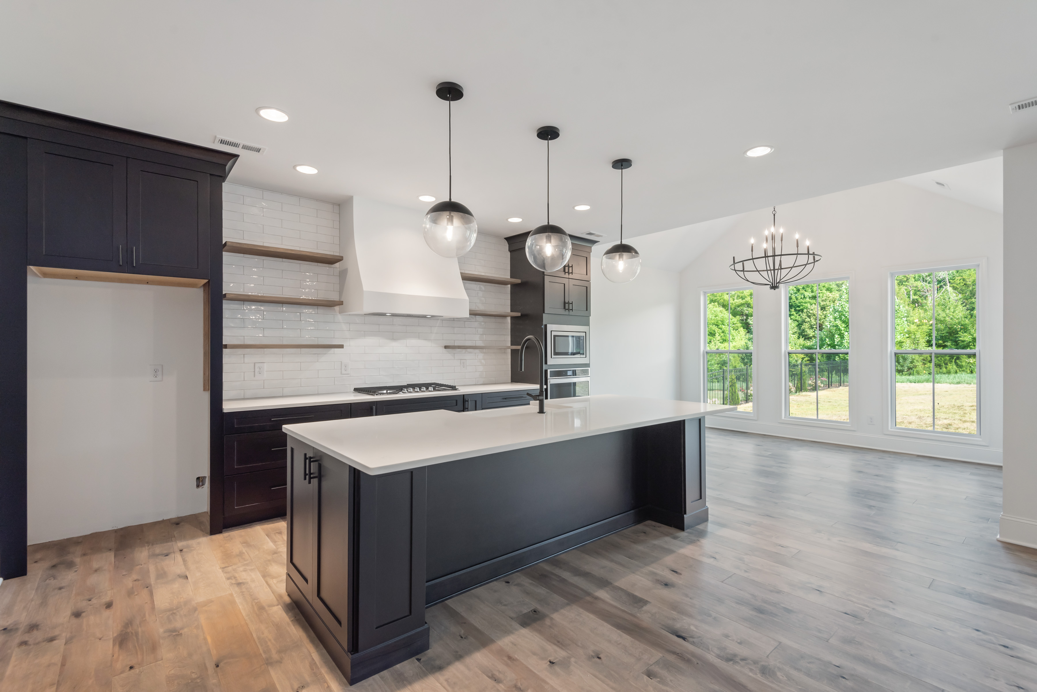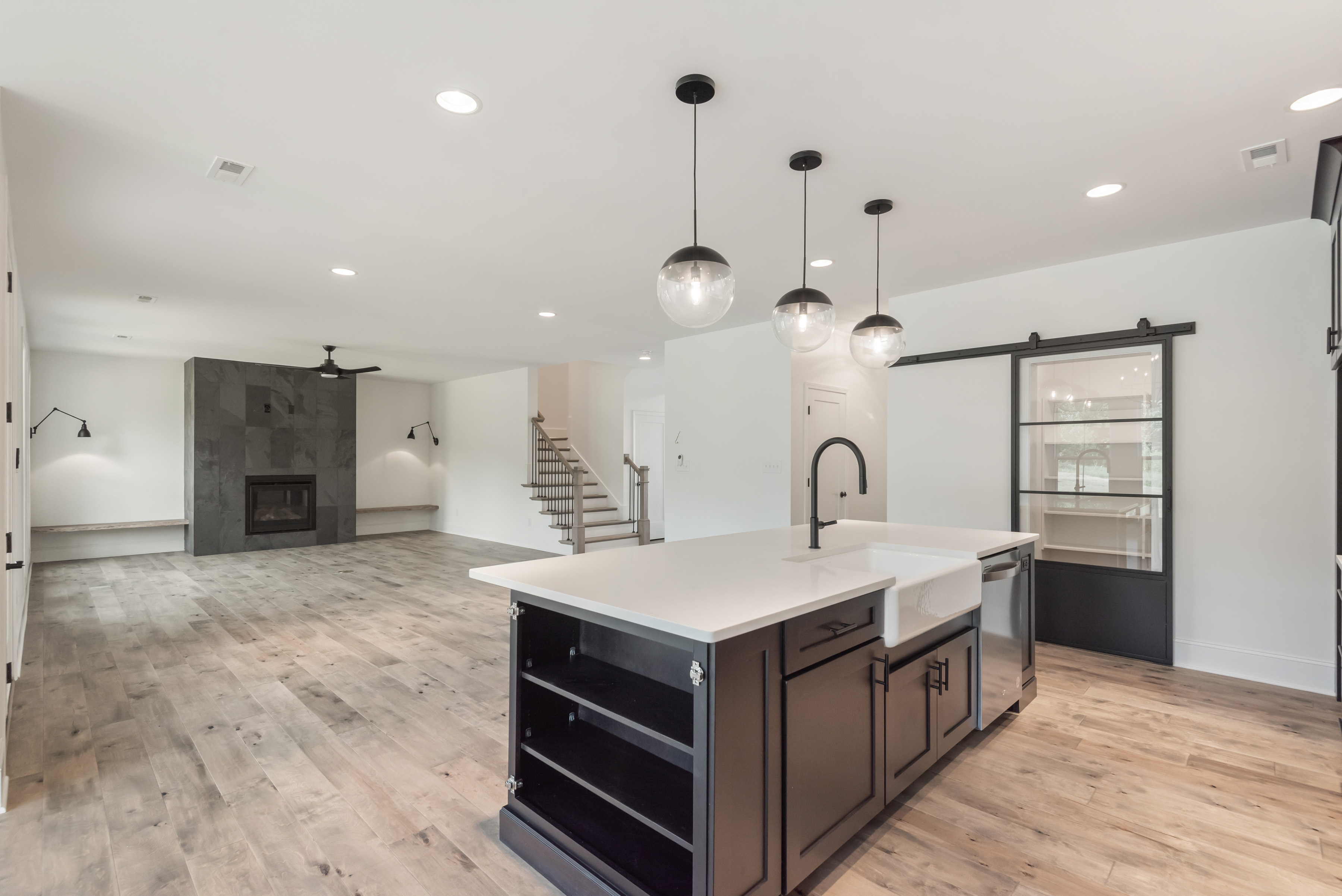 Wall Oven, Wall Microwave, Stainless Kitchen Vent Hood, Gas or Electric Cooktop, Farmhouse Sink