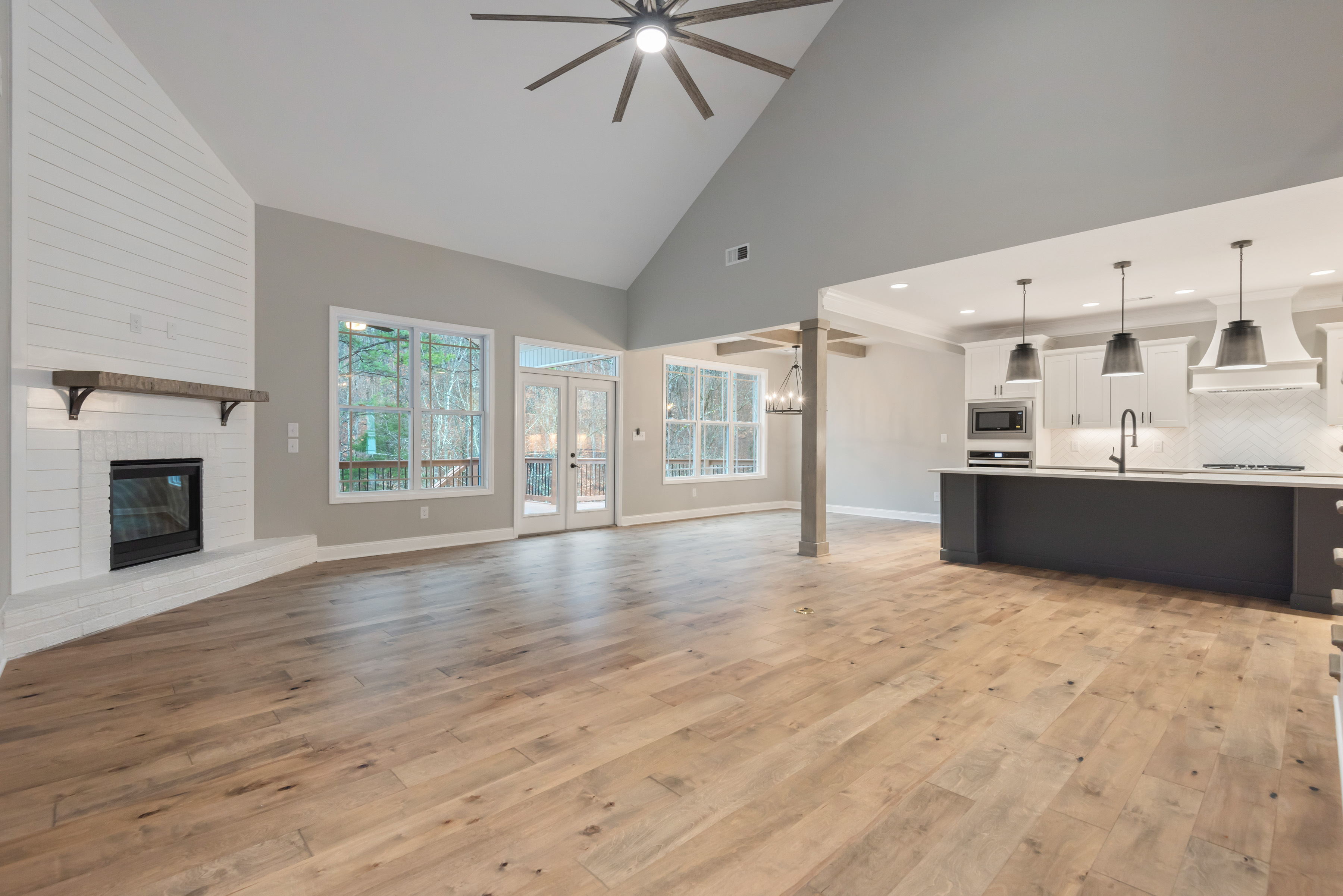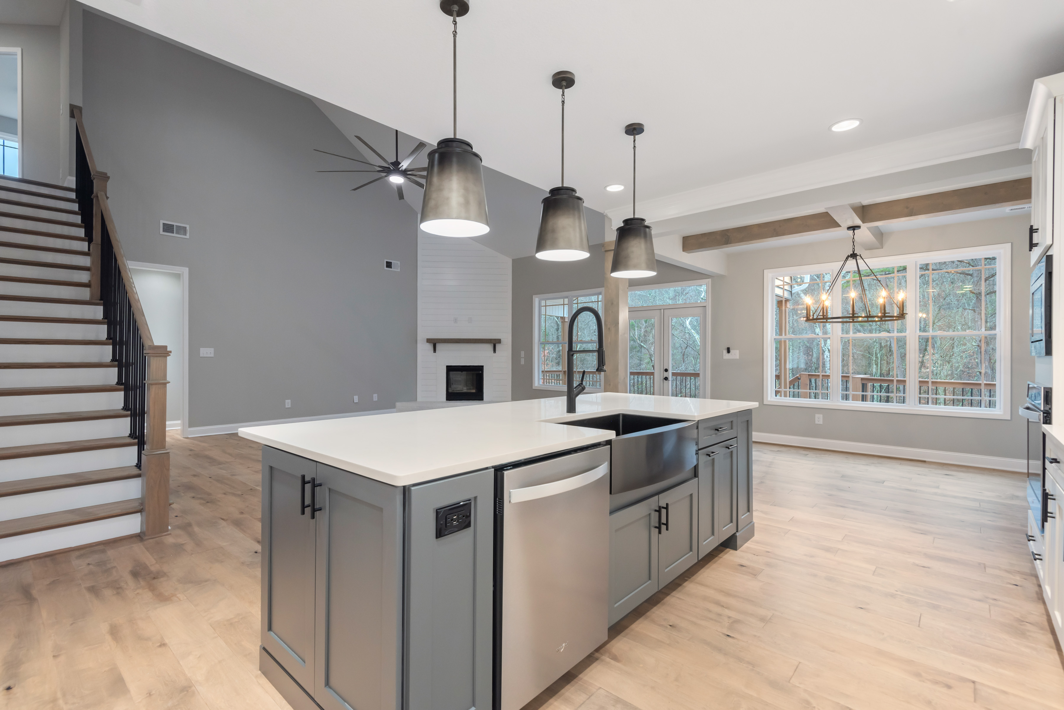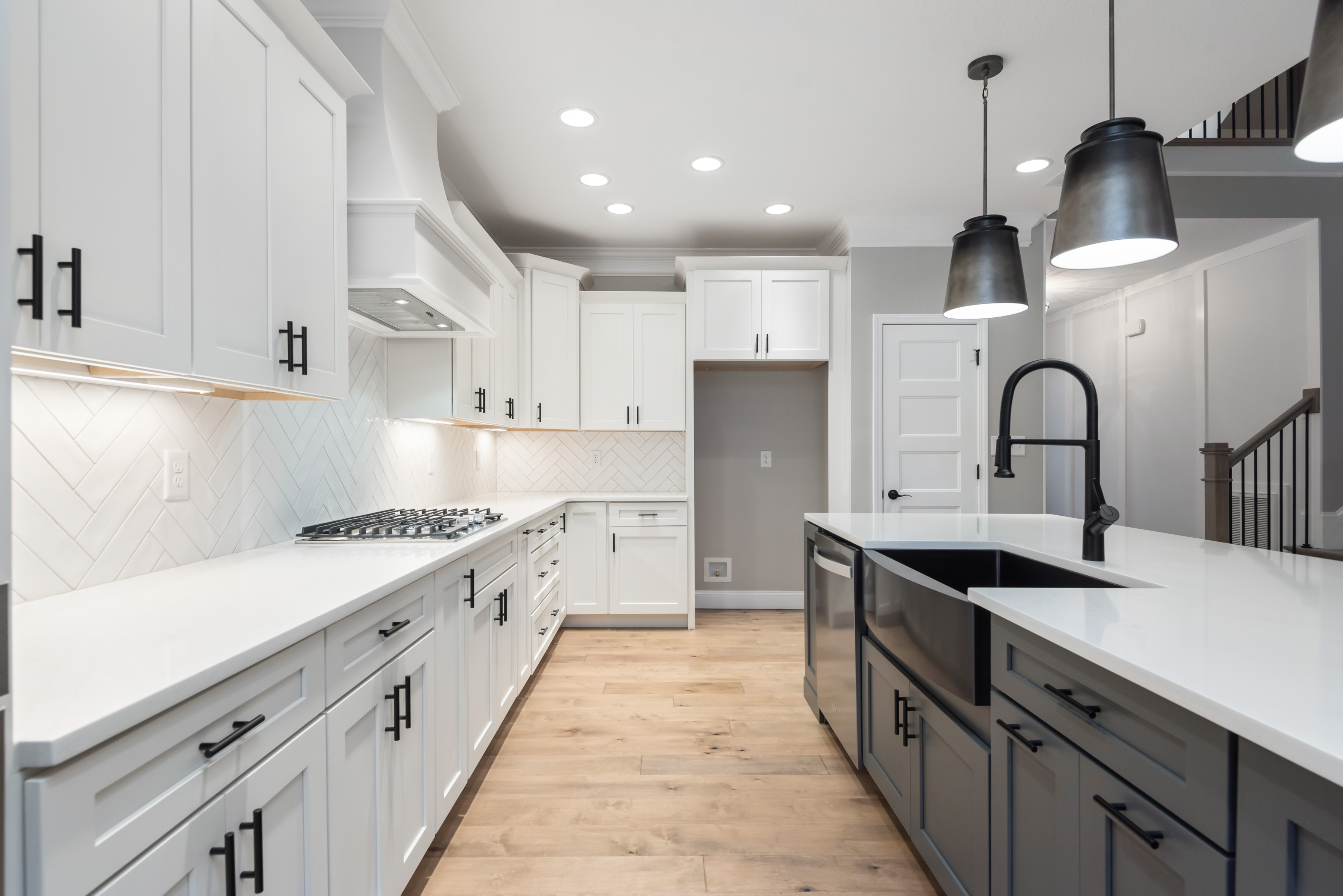 Wall Oven, Wall Microwave, Stainless Kitchen Vent Hood, Gas or Electric Cooktop, Farmhouse Sink